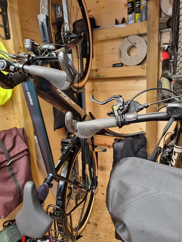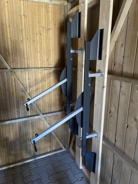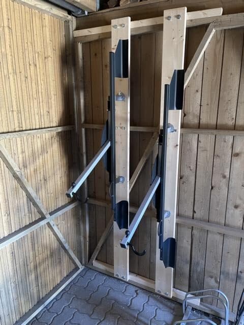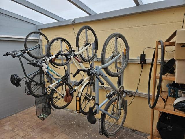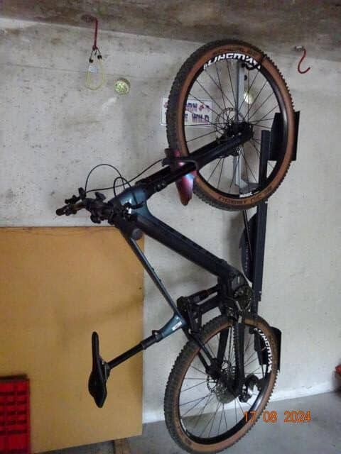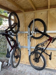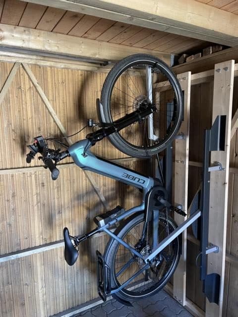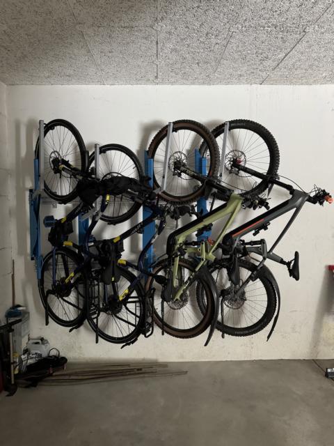„So Herr Meyer, nun also das Bild. Da die Mountainbikes gut 1,90 m haben, bin ich auf 1,60 m gegangen. Ich hatte die oberen Befestigungen schön geschraubt, die unteren markiert, um dann festzustellen, dass ich auf einen Stahlträger gestoßen bin 😵💫 Also habe ich das ganze Konstrukt gewendet und nun oben neue Löcher gebohrt und die ursprünglich oberen für unten verwendet. Daher hängt das ganze Konstrukt nun auf 1,70 m. Bin ja nicht blond 😎 allerdings bin tatsächlich blond, daher darf ich das sagen 🥳 PS 1. You did great mit diesen prima Teilen 2. I did great da ich es an die Wand bekommen habe und die Räder tatsächlich hängen“