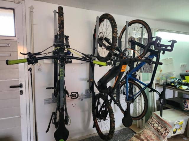 „So Herr Meyer, nun also das Bild. Da die Mountainbikes gut 1,90 m haben, bin ich auf 1,60 m gegangen. Ich hatte die oberen Befestigungen schön geschraubt, die unteren markiert, um dann festzustellen, dass ich auf einen Stahlträger gestoßen bin 😵💫 Also habe ich das ganze Konstrukt gewendet und nun oben neue Löcher gebohrt und die ursprünglich oberen für unten verwendet. Daher hängt das ganze Konstrukt nun auf 1,70 m. Bin ja nicht blond 😎 allerdings bin tatsächlich blond, daher darf ich das sagen 🥳 PS 1. You did great mit diesen prima Teilen 2. I did great da ich es an die Wand bekommen habe und die Räder tatsächlich hängen“